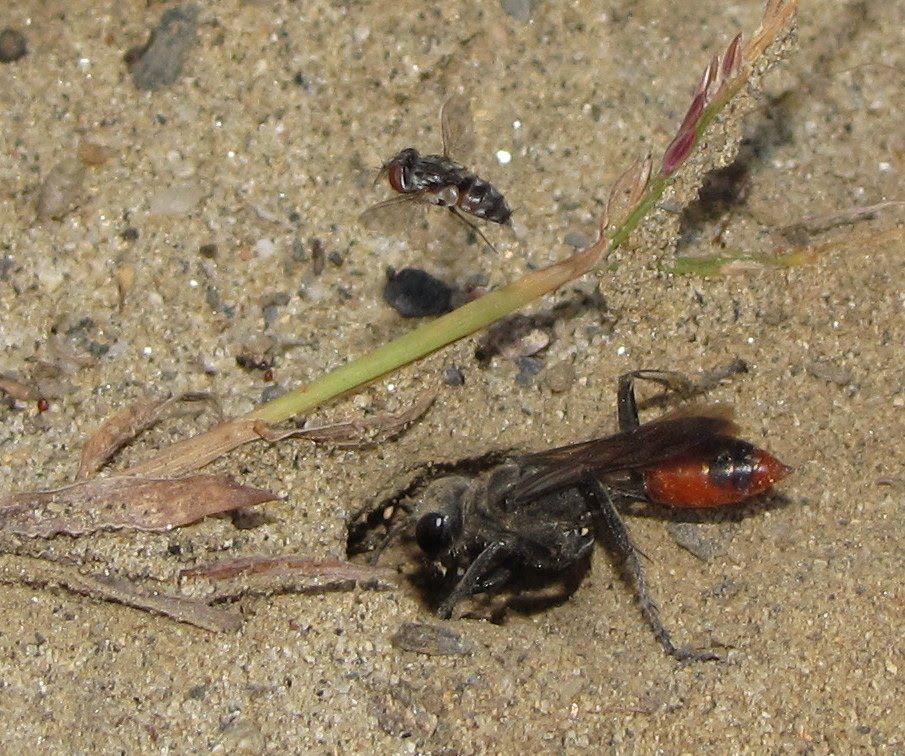 During the process of digging and provisioning the burrow the wasp and her prey are both vulnerable to parasites. Chief among them are the “satellite flies” of the subfamily Miltogramminae (in the family Sarcophagidae). Satellite flies get their name from the way they “orbit” their hosts, waiting for a chance to deposit eggs on the wasp’s prey. The fly larvae that hatch then feed on the food that was intended for the larval wasps, effectively starving them to death. Such behavior is called “kleptoparasitism” when a parasite “robs” the host of its rightful resources. I took the image below in South Deerfield, Massachusetts. The wasp in this case was probably Prionyx canadensis.